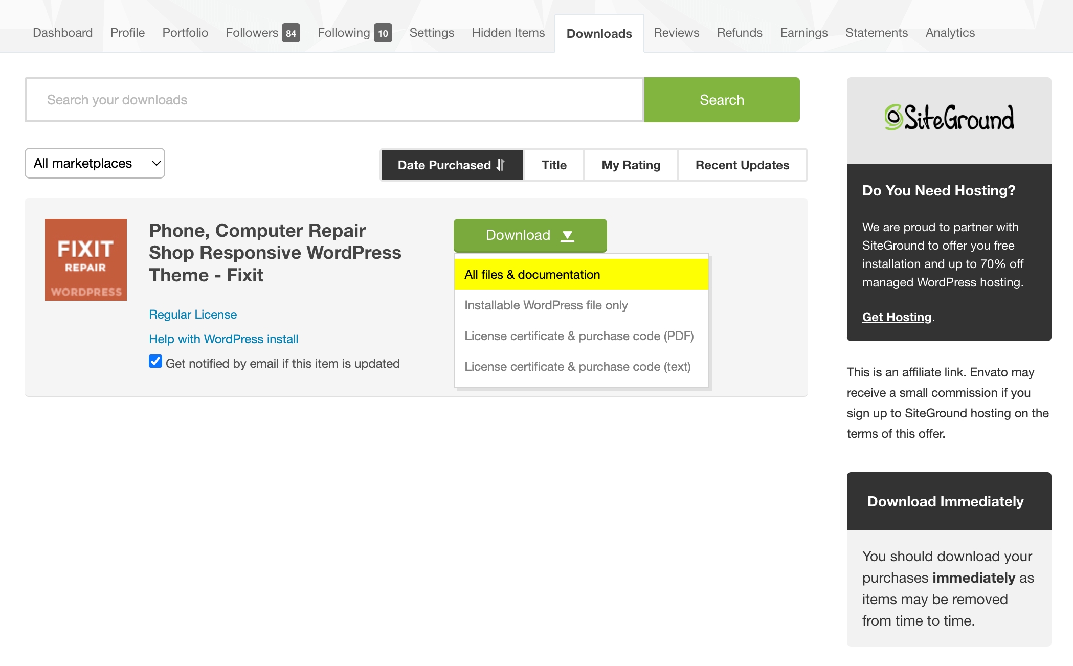 Step 1 – Login to your ThemeForest account and navigate to your Downloads tab and then locate your VisaHub theme purchase.